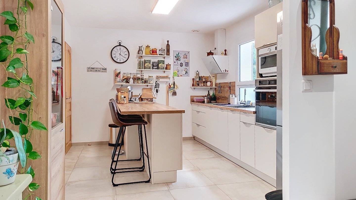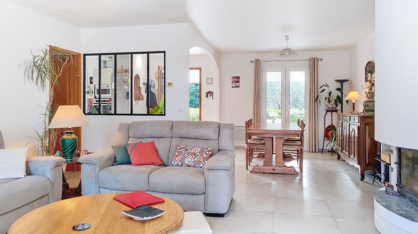EXCLUSIVITE BAGNOLS EN FORET- Située dans un quartier calme et recherché, cette maison de 145 m² vous accueille par une entrée qui mène directement à la pièce de vie lumineuse avec cheminée, verrière et cuisine équipée.