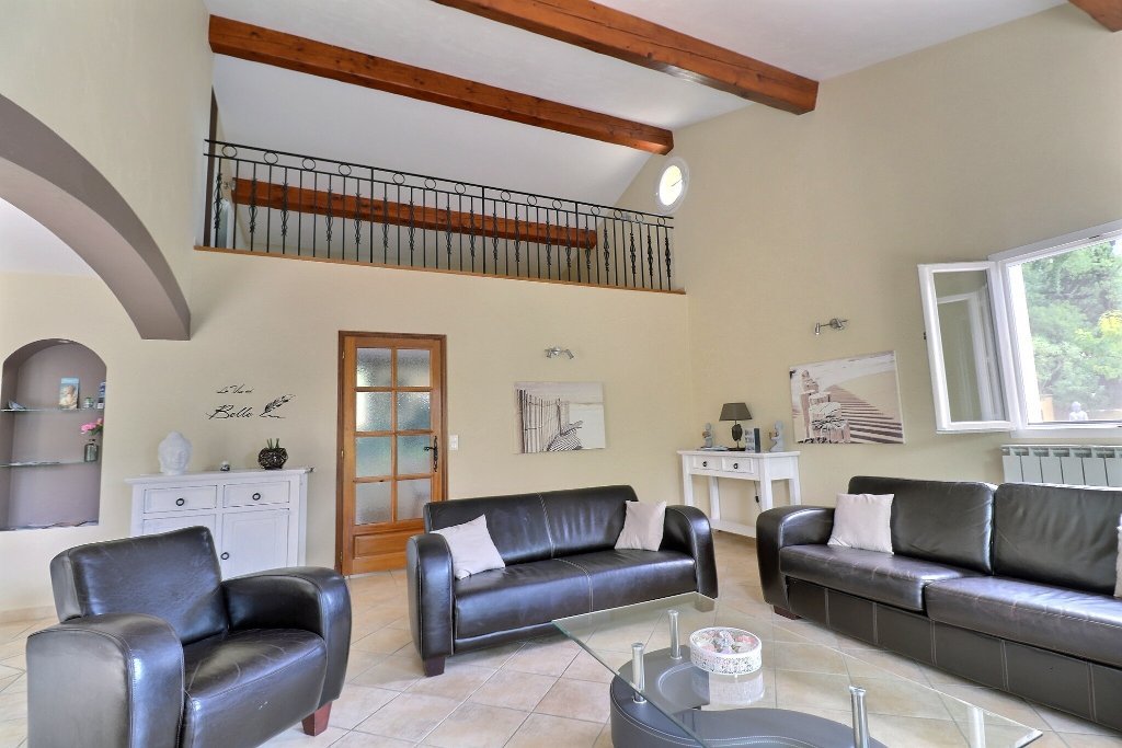 CALLIAN, proche Montauroux dans un havre de paix, quartier recherché , proximité commerces et commodités, villa sans vis à vis dans un écrin de verdure, elle se compose de 2 garages, buanderie, en rez de chaussé une entrée, cuisine équipée aménagée indépendante , donnant sur une terrasse vue piscine, un salon séjour avec toit cathédral vue sur mezzanine, 2 chambres, salle d'eau avec baignoire, grand wc indépendant, à l'étage une mezzanine qui peut servir de bureau ou chambre, un espace détente qui peut être une chambre, 1 chambre parentale avec salle d'eau douche et baignoire, un dressing, piscine et son poolhouse, le tout sur un terrain de 2575 m² fermé par un portail électrique