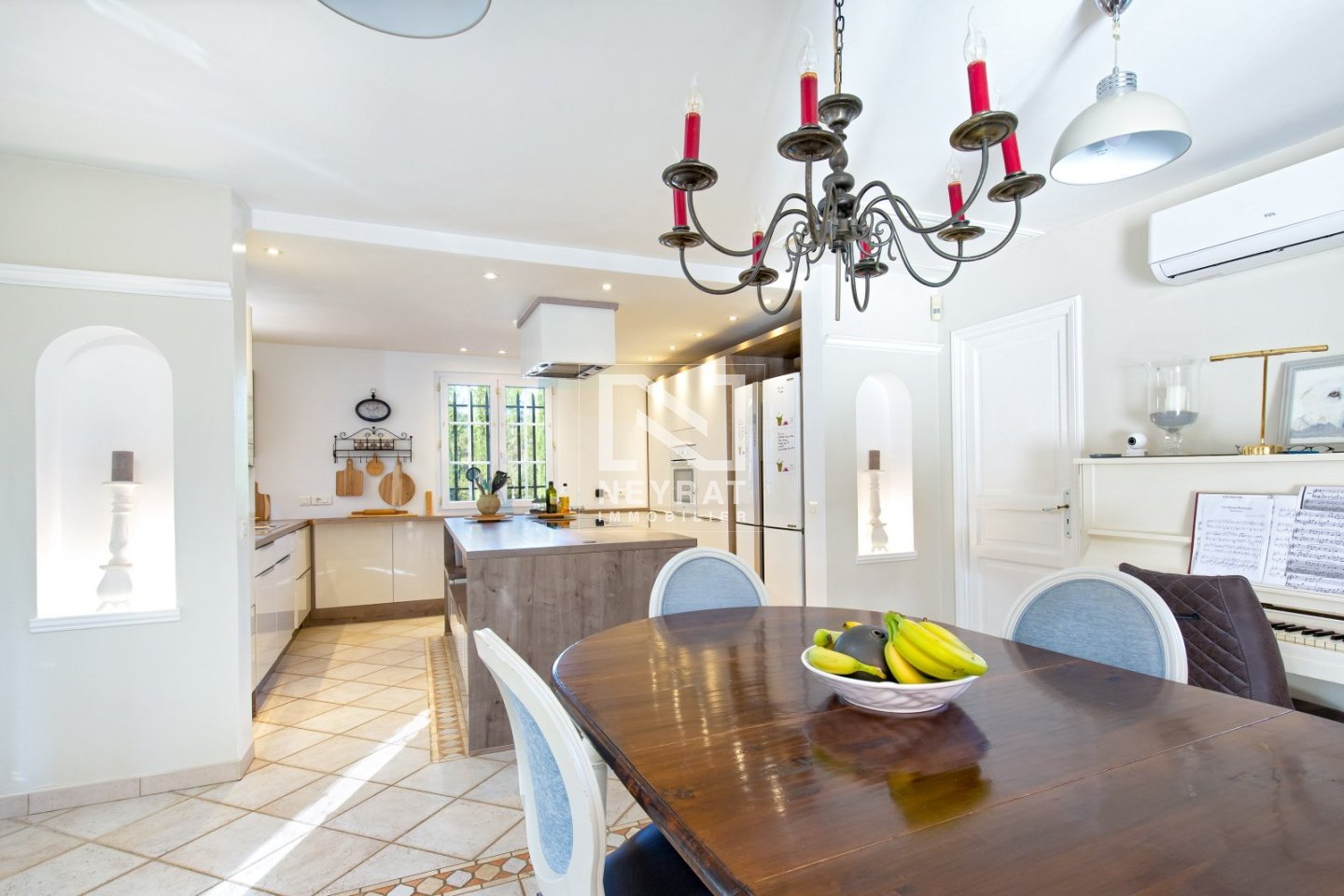 En rez-de-jardin : une superbe entrée sous porche et terrasse, un dégagement avec WC suspendu et lave-mains, un vaste salon avec espace bureau donnant sur l'extérieur, une belle cuisine ouverte avec salle à manger, donnant sur une grande terrasse couverte, un cellier / buanderie avec accès à la cave, une grande chambre avec salle de douche et WC.