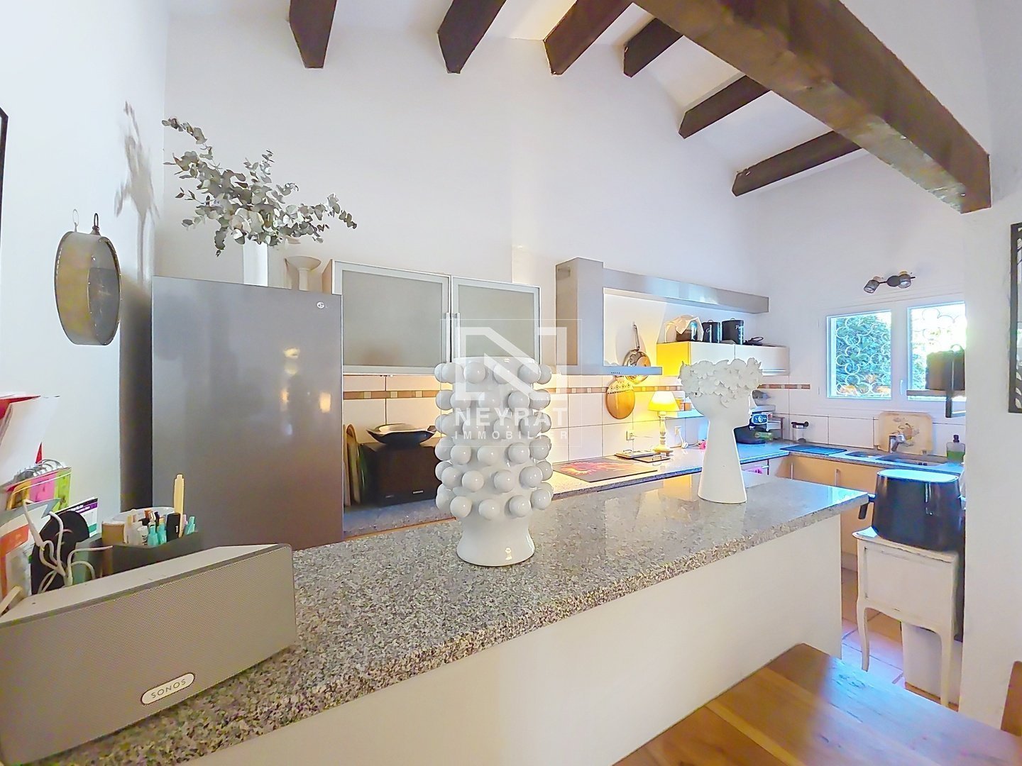 L'entrée ouvre sur une belle pièce de vie avec une cuisine ouverte et un lumineux salon face à la cheminée.