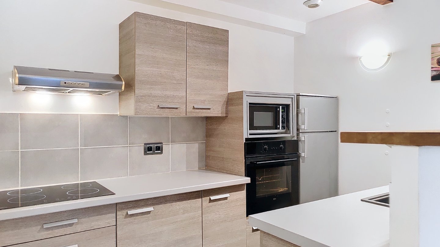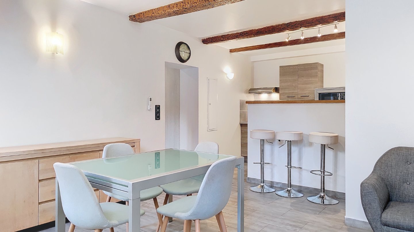 Il se compose comme suit : une entrée, une cuisine équipée ouverte, un salon lumineux avec poutres apparentes qui ajoutent charme et authenticité., salle d'eau et chambre avec placard. Climatisation intégrée dans toutes les pièces.
