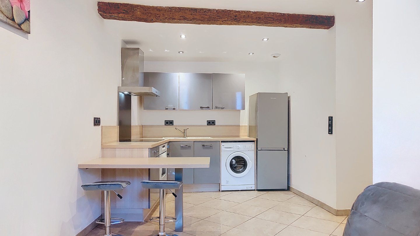 Il se compose comme suit : une entrée, une cuisine équipée ouverte, un salon lumineux avec poutres apparentes qui ajoutent charme et authenticité., salle d'eau et chambre avec placard. Climatisation intégrée dans toutes les pièces.