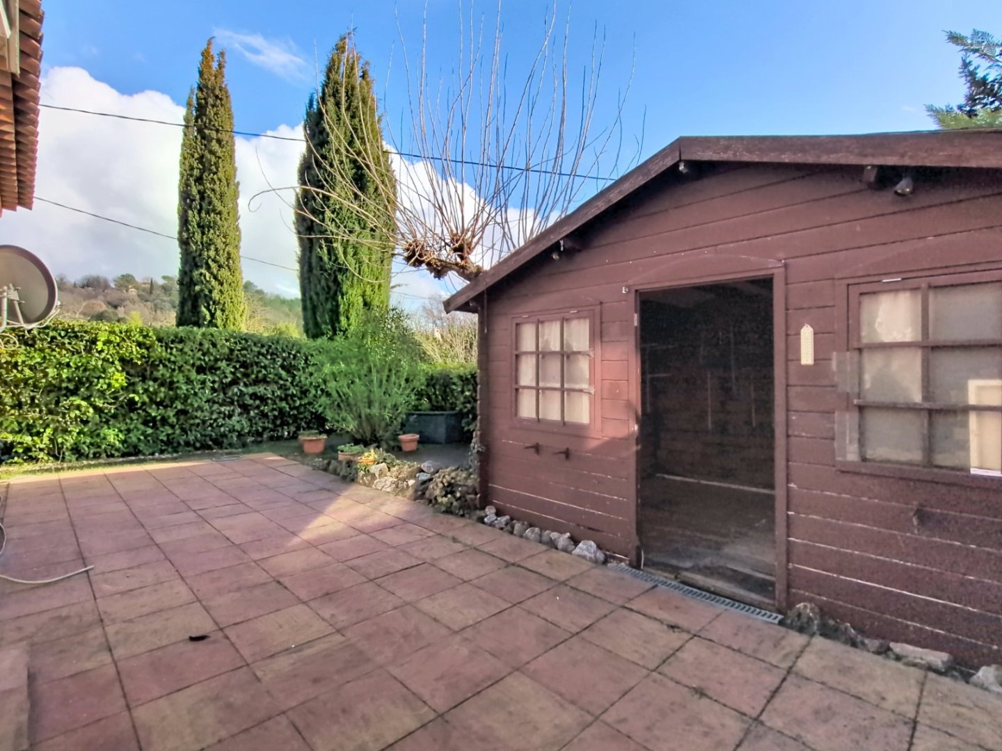 Terrasse semi couverte avec rangement et un chalet dans le jardin.