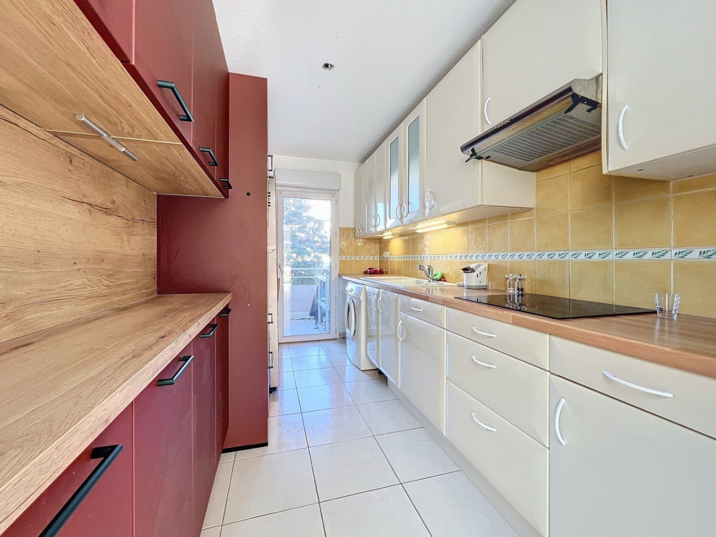 Entrée desservant, deux chambres avec placard, salle de douche avec fenêtre, WC séparé, cuisine, séjour, entièrement aménagée et équipée donnant sur un balcon..
