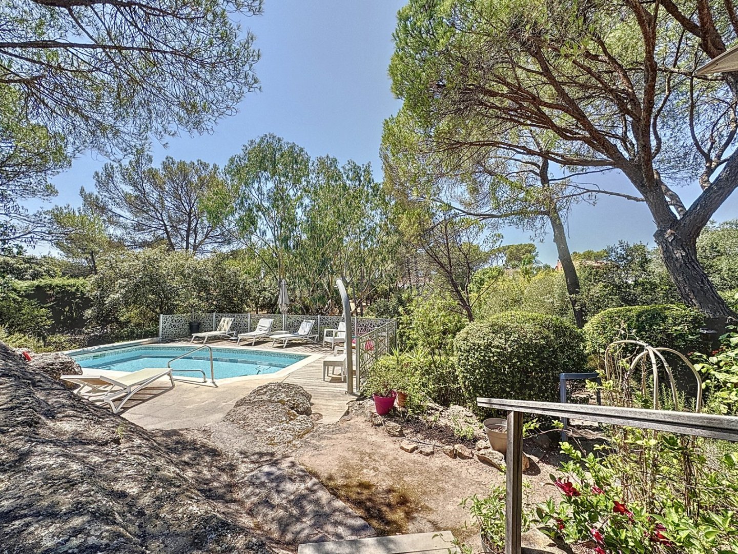 - Dans un domaine proche des commerces villa pleine de charme en parfait état comprenant sur un magnifique terrain arboré de 1550 m2 , une entrée, un séjour salon avec cheminée , une cuisine , 2 chambres, une grande salle d'eau, à l'étage 2 chambres une salle d'eau dgt , wc et une magnifique piscine.